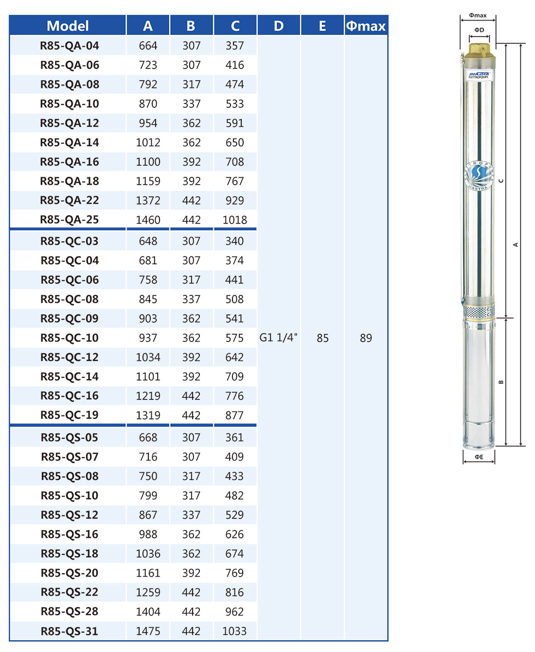 Electric submersible pumps are with radial or semi-axial imperllers.The impellers and the diffusers are in plastic material(noryl),whereas the bearings are in ceramic/rubber lubricated by the water circulation.Check valve is incorporated in the delivery body with threaded outlet.The coupling Pump-motor is according to NEMA regulations.