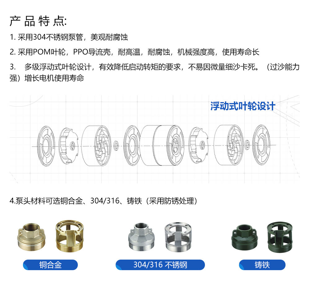 充分利用世界先進(jìn)國家的工藝技術(shù),例如美國和意大利。泵主體部分采用不銹鋼及銅合金制造,具有高效、節(jié)能、耐磨、防銹、美觀、安裝方便等特點(diǎn)。適用于家庭,民用和工業(yè)應(yīng)用,包括供水灌溉,沖洗系統(tǒng)和增壓。