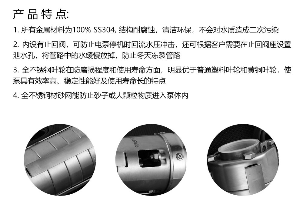 葉輪、導(dǎo)流殼、泵頭、泵座等金屬部件均采用耐磨防腐的304不銹鋼, 并采用先進(jìn)的沖壓工藝制成。軸座膠軸承采用耐磨橡膠材料。聯(lián)軸器與電機(jī)的連接方式符合NEMA標(biāo)準(zhǔn)。我們的葉輪和導(dǎo)流殼是按照高效率、高可靠性和長壽命的要求設(shè)計和制造的。