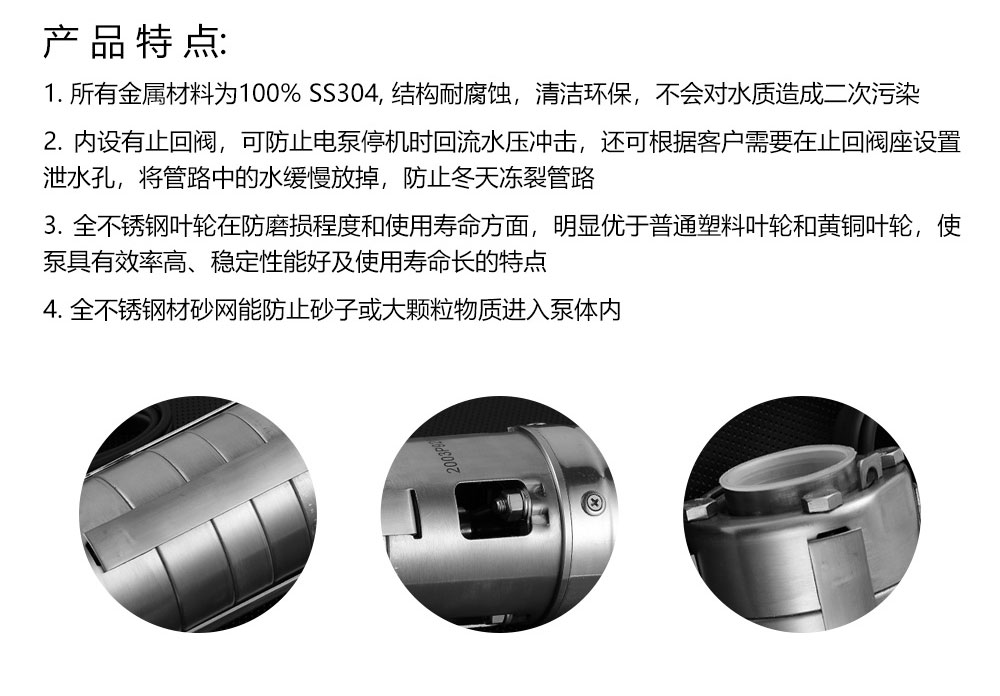 葉輪、導(dǎo)流殼、泵頭、泵座等金屬部件均采用耐磨防腐的304不銹鋼, 并采用先進(jìn)的沖壓工藝制成。軸座膠軸承采用耐磨橡膠材料。聯(lián)軸器與電機(jī)的連接方式符合NEMA標(biāo)準(zhǔn)。我們的葉輪和導(dǎo)流殼是按照高效率、高可靠性和長壽命的要求設(shè)計和制造的。