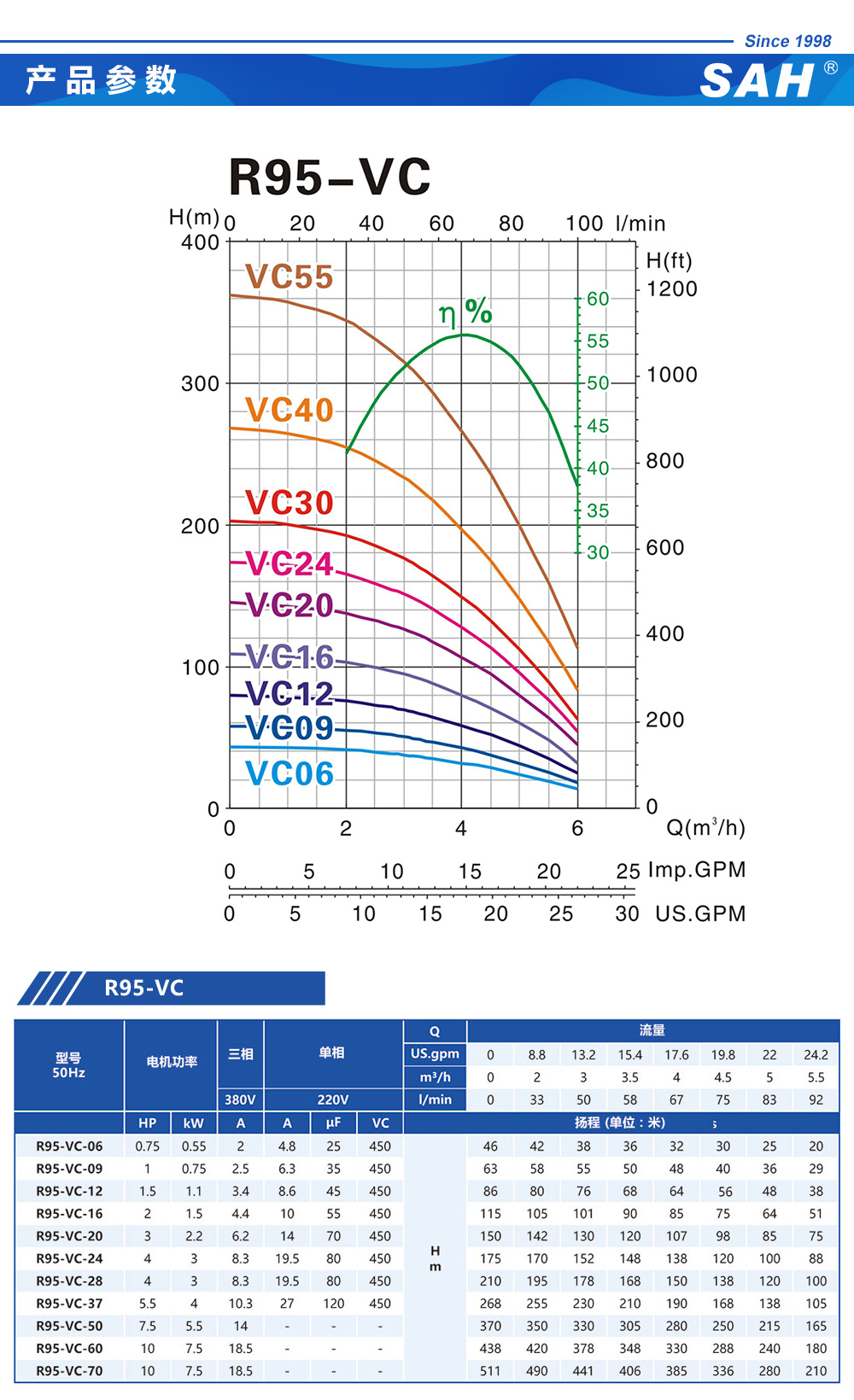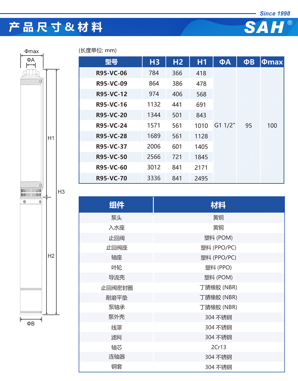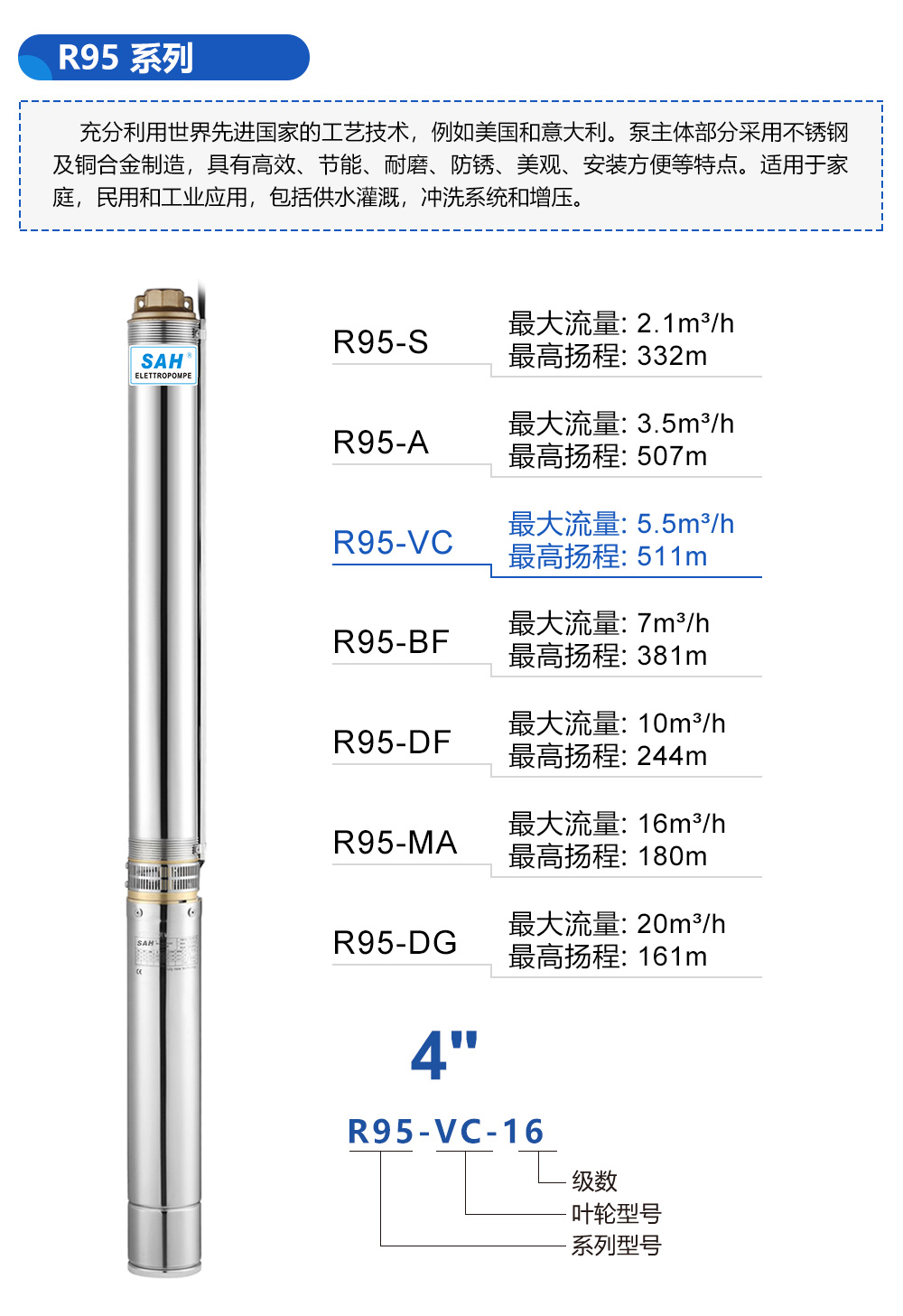 SAH 鯊魚牌 4寸不銹鋼深井泵 R95井用潛水泵