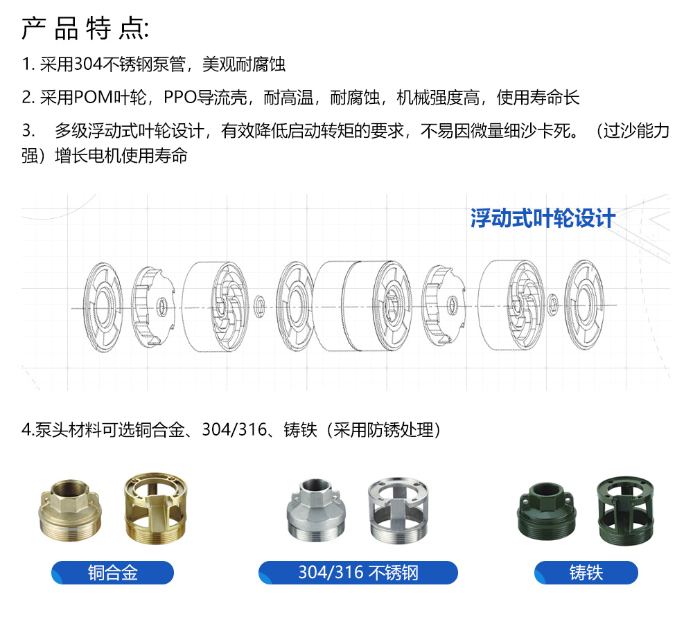 4.泵頭材料可選銅合金、304/316、鑄鐵(采用防銹處理)
