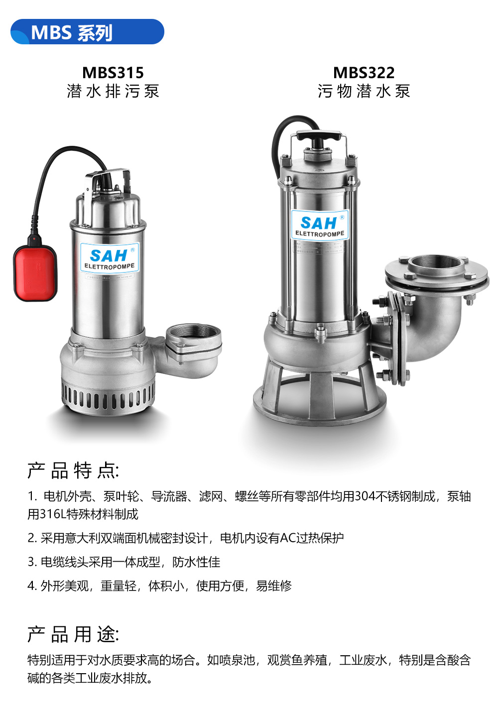 SAH 鯊魚牌 工業(yè)家用排水排污潛水泵 MBS全不銹鋼耐腐蝕污水泵