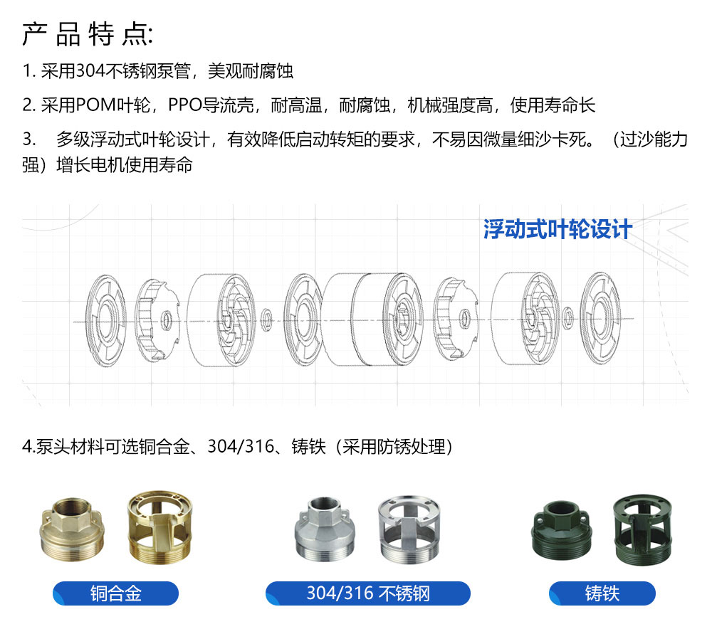 充分利用世界先進(jìn)國(guó)家的工藝技術(shù),例如美國(guó)和意大利。泵主體部分采用不銹鋼及銅合金制造,具有高效、節(jié)能、耐磨、防銹、美觀、安裝方便等特點(diǎn)。適用于家庭,民用和工業(yè)應(yīng)用,包括供水灌溉,沖洗系統(tǒng)和增壓。